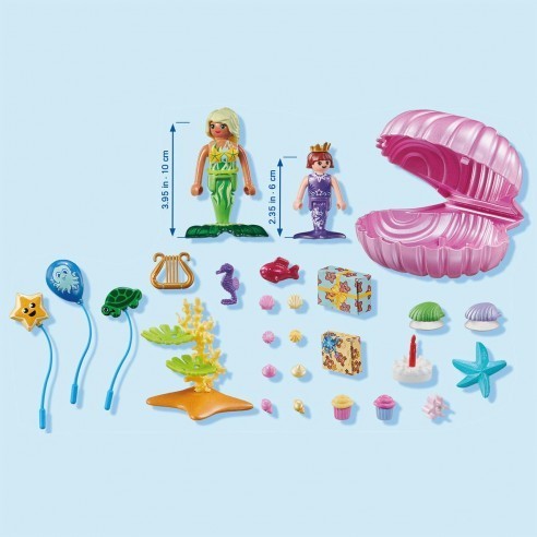 Dive into the enchanting world of the PLAYMOBIL Mermaid Birthday Party! This set, suitable for children aged 4 and up, offers endless hours of fun. The giant seashell serves as the stage for the party, where you can place balloon holders and gifts. With just one gift, the shell can be closed. The small seashells magically adhere to smooth surfaces. The coral leaves provide a perfect spot for cakes and muffins. The mermaids can sit or stand with their tails flipped up.