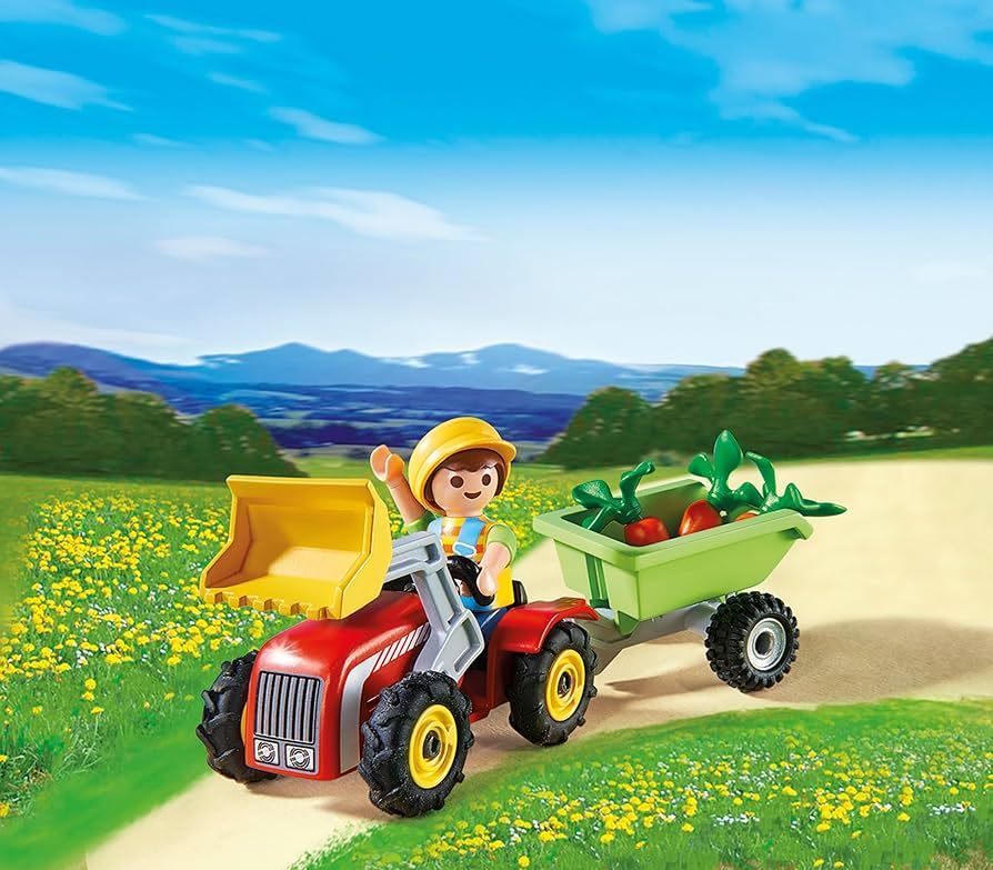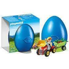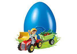 The Playmobil Boy with Children’s Tractor Gift egg includes a tractor that has a functional lift arm and bucket with detachable trailer to transport the freshly picked carrots.