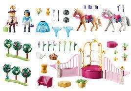 The riding instructor teaches the princess how to ride elegantly. Even a princess in a skirt can ride the side saddle. The stable and of course the horses, that is Pina's world. She feels at home here and prefers to spend the whole day with her beloved animals. As a royal riding instructor, she teaches the princesses how to ride and teaches them everything important about horse care and the correct handling of the proud four-legged friends. A real princess rides a side saddle, of course, but that can be a challenge. But even difficult cases are no problem for Pina, she always finds a solution. The play set contains the PLAYMOBIL figures Pina and the King, two horses and a bird, stable elements and a drawer cabinet in which small parts can be stored. The set also includes riding helmets and a saddle, as well as a new women's saddle through which figures with skirts can ride horses.