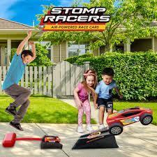 Coming fast and furious, a twist on the Original Stomp Rocket, is the NEW Stomp Racers!!! The race is on! Watch your kids run, jump and stomp away from screens and race to the finish. These kid-powered race cars provide hours of active play with toy vehicles that race, jump, tumble, crash and perform epic stunts. Easy to put together, kids will be off to the races in no time, seeing how far and fast they can launch their cars.